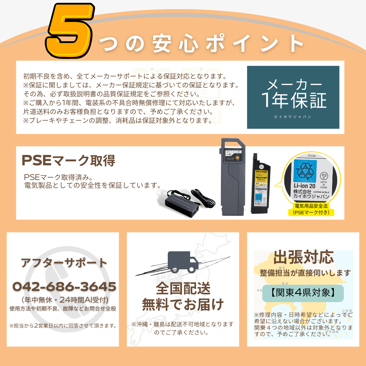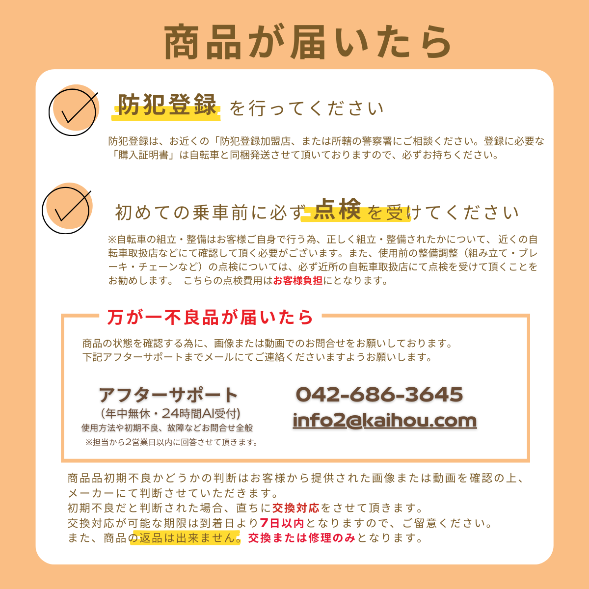 【初期不良・返品について】 出荷完了後の返品はお受付出来かねますので、予めご了承ください。 初期不良を含め全てメーカーサポートによる保証対応となります。 ■カイホウジャパンサポートセンター 電話番号:042-686-3645(24時間AIによる受付) 【自転車の初期整備・点検について】 本製品を受け取ったら、お客様自身で下記の組立作業を行う必要がございますので、必ずご確認ください。 ・ハンドルの取付け(ハンドルは取り外された状態でのお届けとなります) ・本体の組立 ・ペダルの取付け ※必要な組立道具は同梱させて頂いておりますので、取扱説明書をご確認上、作業を行ってください。 ※空気入れは必要に応じてお客様ご自身でお願いいたします。 【自転車取扱店などにて整備士による整備点検を受けてください】 メーカー直送品の場合、自転車の組立・整備はお客様ご自身で行う為、正しく組立・整備されたかについて、 近くの自転車取扱店などにて確認して頂く必要がございます。 大変お手数をお掛け致しますが、使用前の整備調整(組み立て・ブレーキ・チェーンなど)の点検については、 下記防犯登録手続きの際に、必ず近所の自転車取扱店にて点検を受けて頂くことをお勧めします。 【その他】 メーカー直送品の為、代引き決済が出来かねます。 |